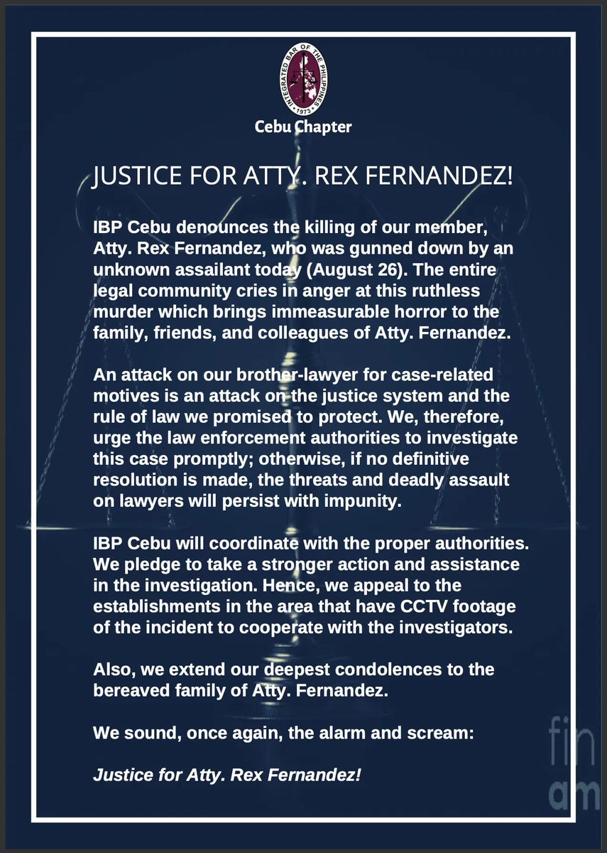 THE NATIONAL Union of Peoples Lawyers-Cebu Chapter vehemently condemns the ruthless killing of Atty. The video shows a news from cebu city where Atty Rex Fernandez is ambushed by an unknown suspect in Cebu City from his carFull videohttpsyoutuberbvhj6. Just hours after the killing of Atty.