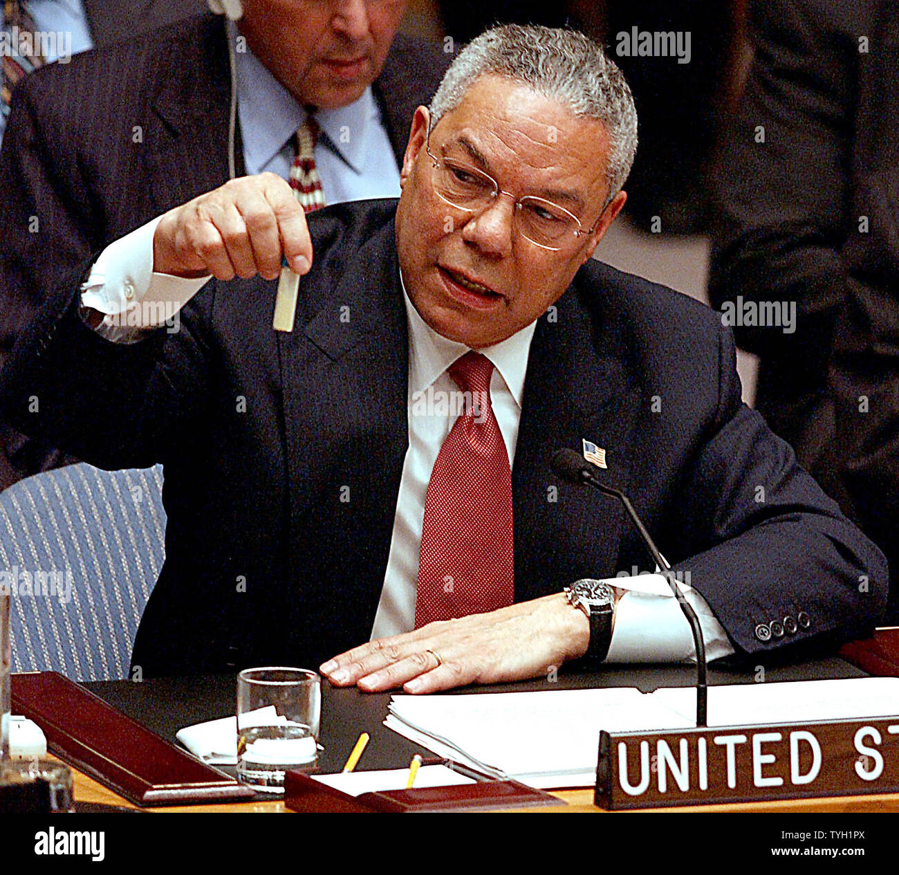 Le Secretaire D Etat Americain Colin Powell Illustre En Fevrier 2003 La Tenue D Une Petite Fiole D Une Substance Non Letales De Demontrer La Quantite De Charbon Utilise Dans Des Attaques Sur Capitol Hill